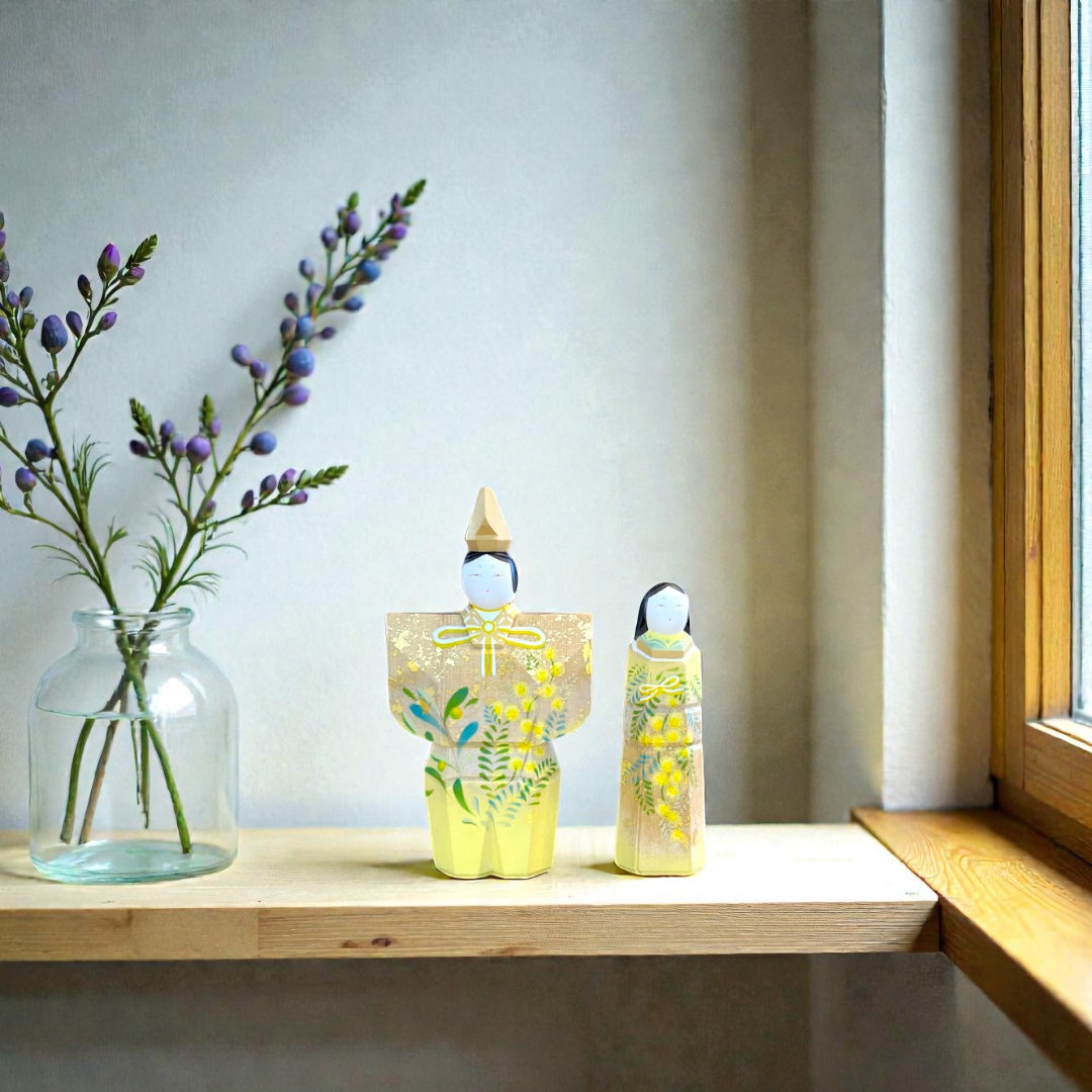 「ありがとう」と「幸せ」を結ぶ 春の祝いに寄り添う立雛。今ある幸せに感謝し、今後の平和を願う意味を込めて。女雛がミモザの花束を持っているようなデザイン。母の日や大切な人へのギフトにもお勧めの作品。
